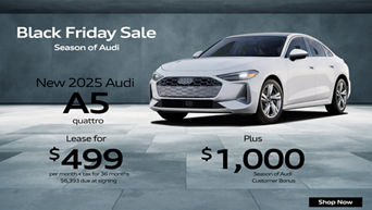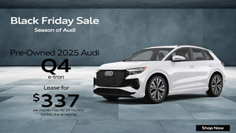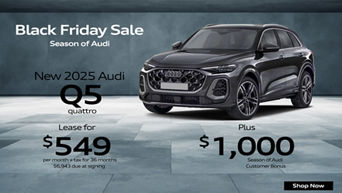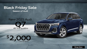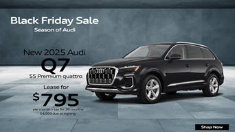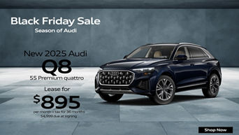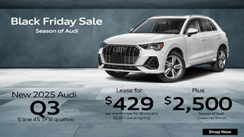 *Closed-end lease financing available through 12/01/2025 for a new, unused 2025 Audi Q3 S line 45 TFSI quattro Premium on approved credit to highly qualified customers by Audi Financial Services through participating dealerships. Lease offer only eligible to customers residing in CA. Monthly lease payment based on MSRP of $43,140 and destination charges, less a suggested dealer contribution, and application of $2,500 lease bonus resulting in a capitalized cost of $34,542. Lease bonus not redeemable for cash. Excludes tax, title, license, options, and dealer fees. $0 security deposit required. Amount due at signing includes first month’s payment, customer down payment of $3,999 and acquisition fee of $895. Monthly payments total $15,444. Your payment will vary based on final negotiated price. At lease end, lessee is responsible for disposition fee of $495, $0.25/mile in excess of 30,000 miles and excessive wear and use. A $395 fee applies if you purchase your lease vehicle. Offer not valid in Puerto Rico. See your local Audi dealer for details or, for general product information, call 1-800-FOR-AUDI. © 2025 Audi of America, Inc.